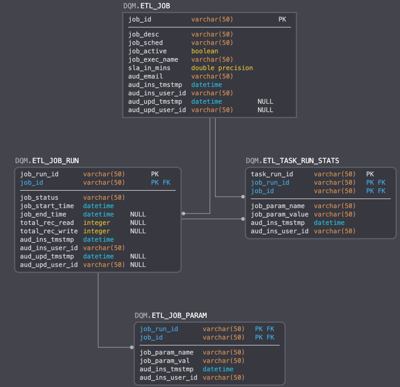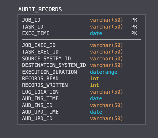What happens if we cannot rerun our ETL job? How do we make our erroneous records known? Did our Audit process gather enough information to flag an issue for manual intervention by a Data Engineer? Based on the above schema, the answer is "yes." Notice in the ETL_JOB table there are some fields preceded by the AUD_ prefix. The AUD_EMAIL field should point to the email of the data engineer that is equipped to fix any issues flagged by the ABC framework.
