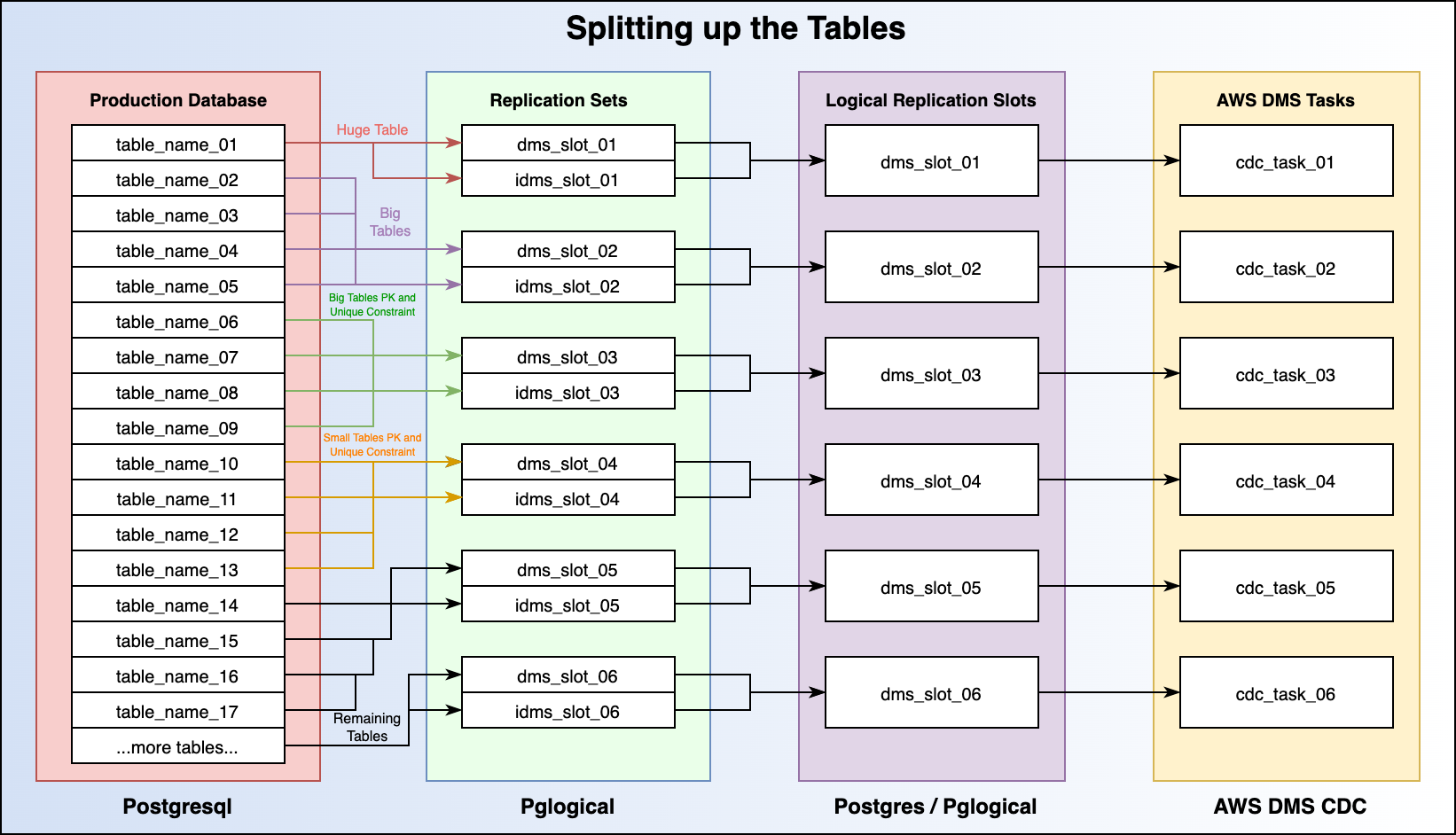 Each Replication Slot will map to one DMS task. It is important to put tables together that make sense. For instance, huge and very busy tables should have a fully dedicated slot. Tables that have primary keys and unique constraints should be put together. Tables that are closely related should be kept in the same slot. Do your research and run lots of tests. After each iteration of the migration process, apply new settings and resolve issues that arise. This is by far the hardest part of the migration to nail down properly.