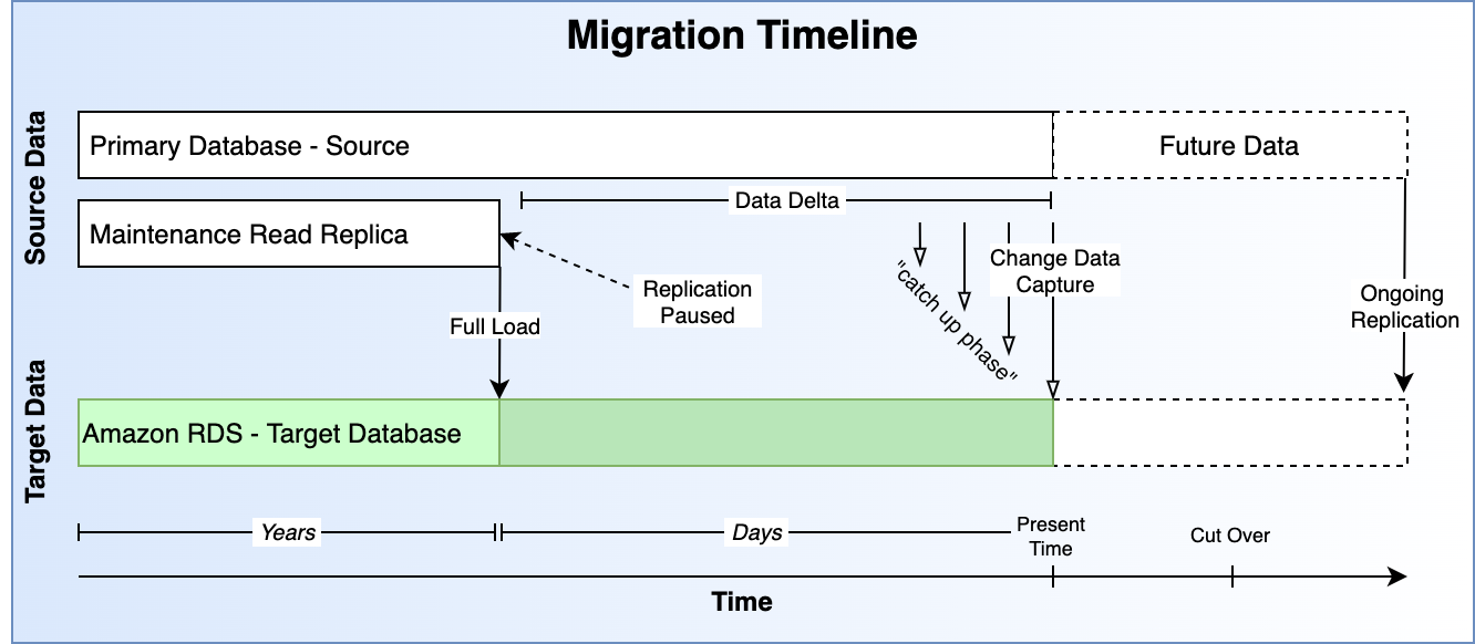 In order to minimize risk and in an effort to not interfere with production, a fresh, separate read replica should be created and utilized for the migration. Replication will be paused on this new separate read replica before performing full load, the current production read replica will continue to replicate and can still be used in the case of an emergency. Information surrounding the point in time backup will be garnered from this new read replica and used to load any changed data after full load is completed.