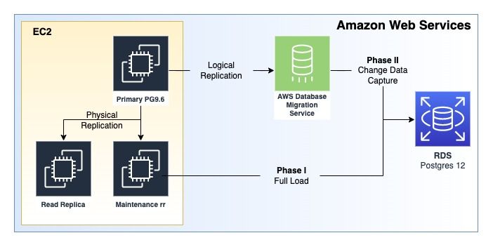 Phase I - Full Load: use pg_dump and \copy to get the bulk of the data transferred. The full load portion utilizes the maintenance read replica (see below) in a paused state and the RDS instance. DMS does provide a full load option, but on certain databases it can fail to complete. Part 1 of the series will cover all the steps to get through the Prerequisites section and Phase I.