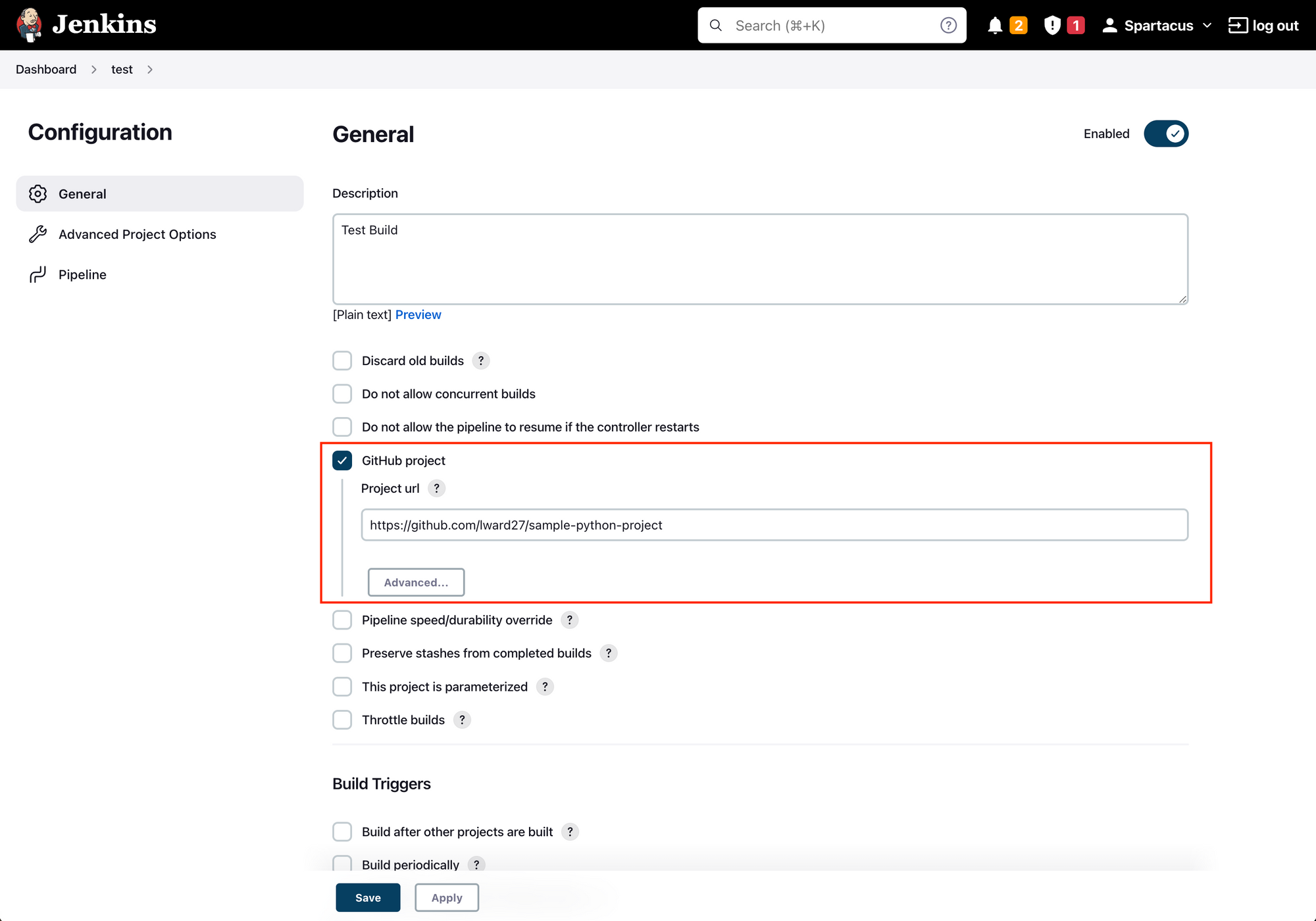 Beneath the description are some checkboxes. The one we are interested in is GitHub project. Click the box and populate your GitHub url for the sample-python-project repository. You can skip the build triggers section for now, but this is where you would come if you wanted to trigger a build via some type of automated action.