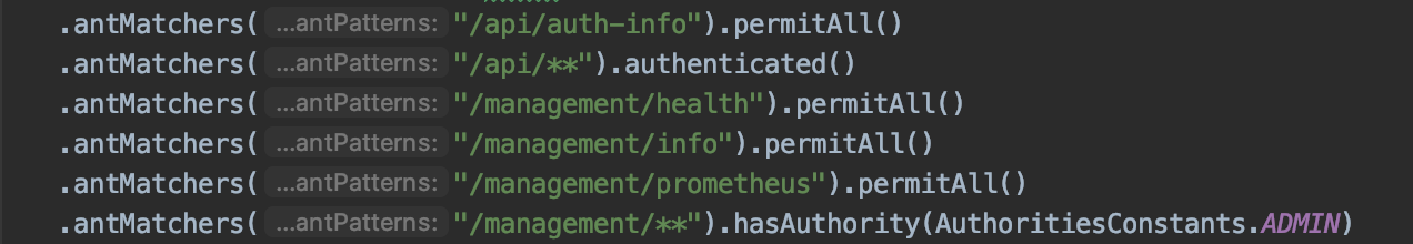 Using Spring Security we can now limit access to our APIs based on user authorities. If you open up your SecurityConfiguration class on a JHipster application you'll find how JHipster configures access control: