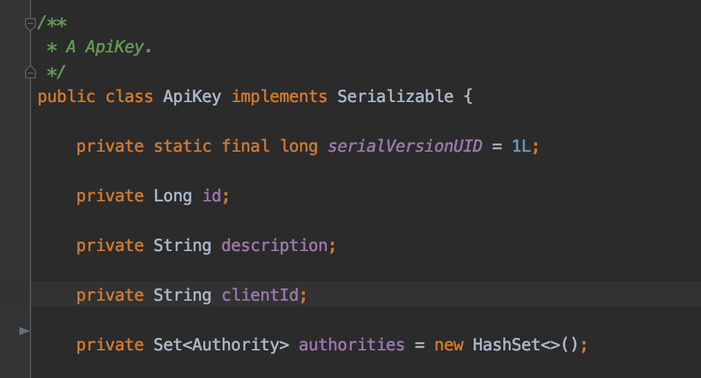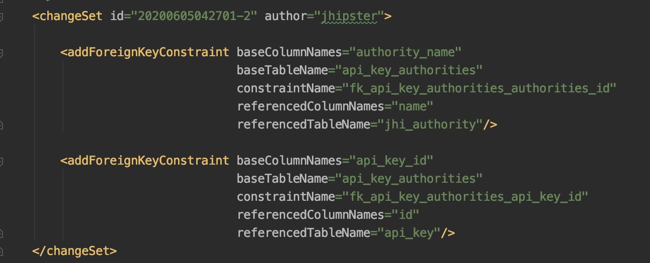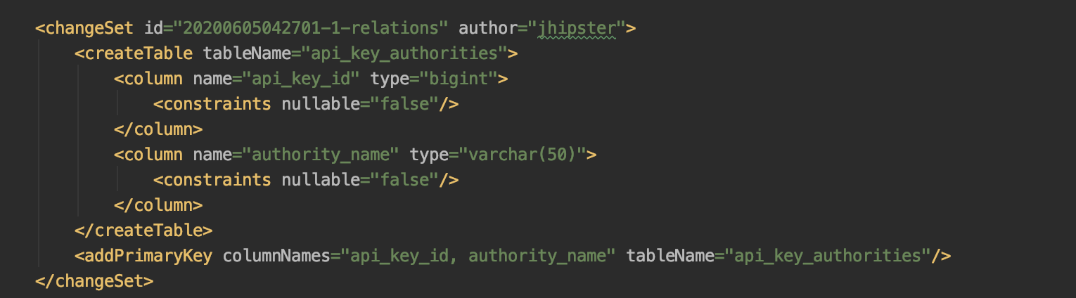In our JDL you may have noticed the entity ApiKey, this was generated with this solution in mind. However since Authorities are already setup for Users, we'll just hook in the relationship in ApiKey. First lets add a new table: