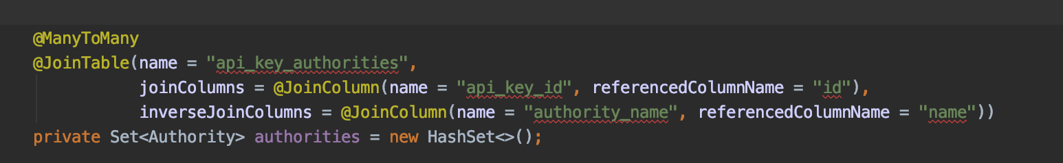 Then modify our ApiKey Entity class to add a Many to Many relationship: