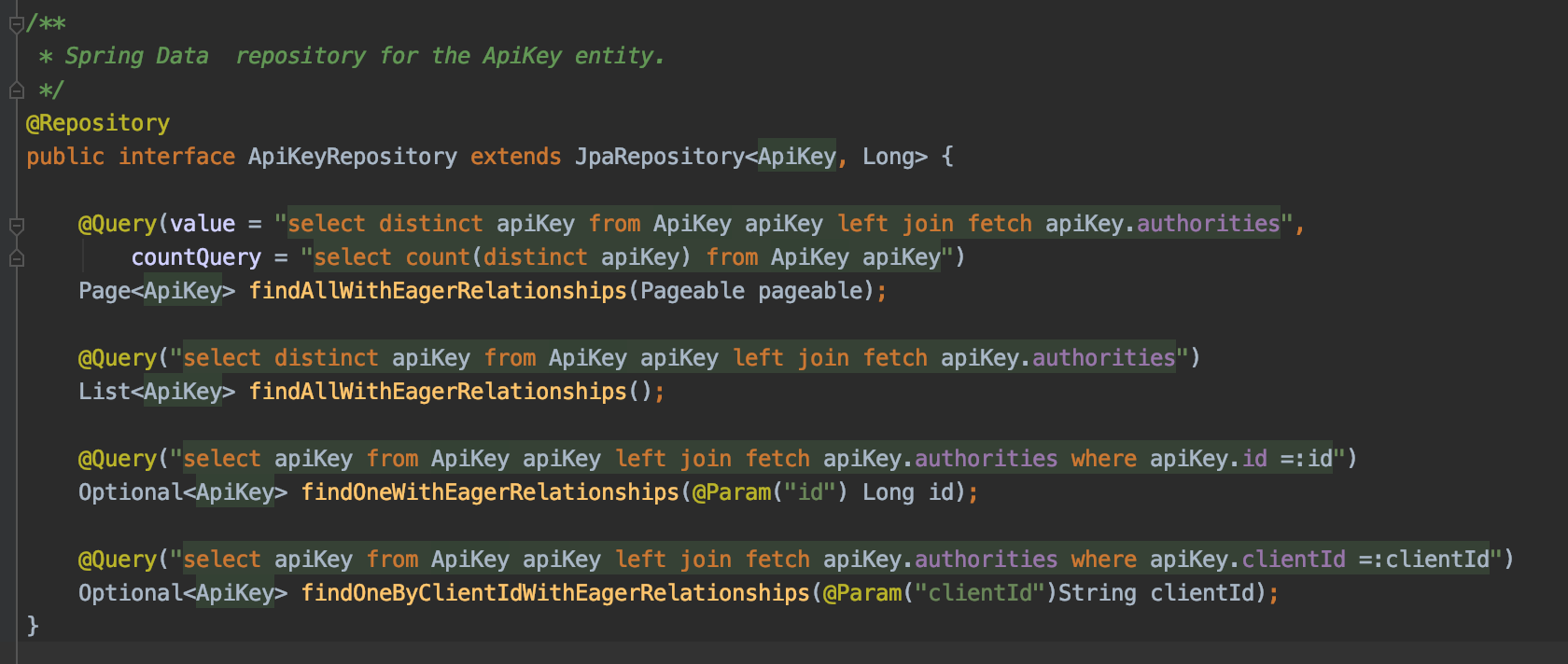 As well as our ApiKeyRepository to add the queries needed to load the relationship: