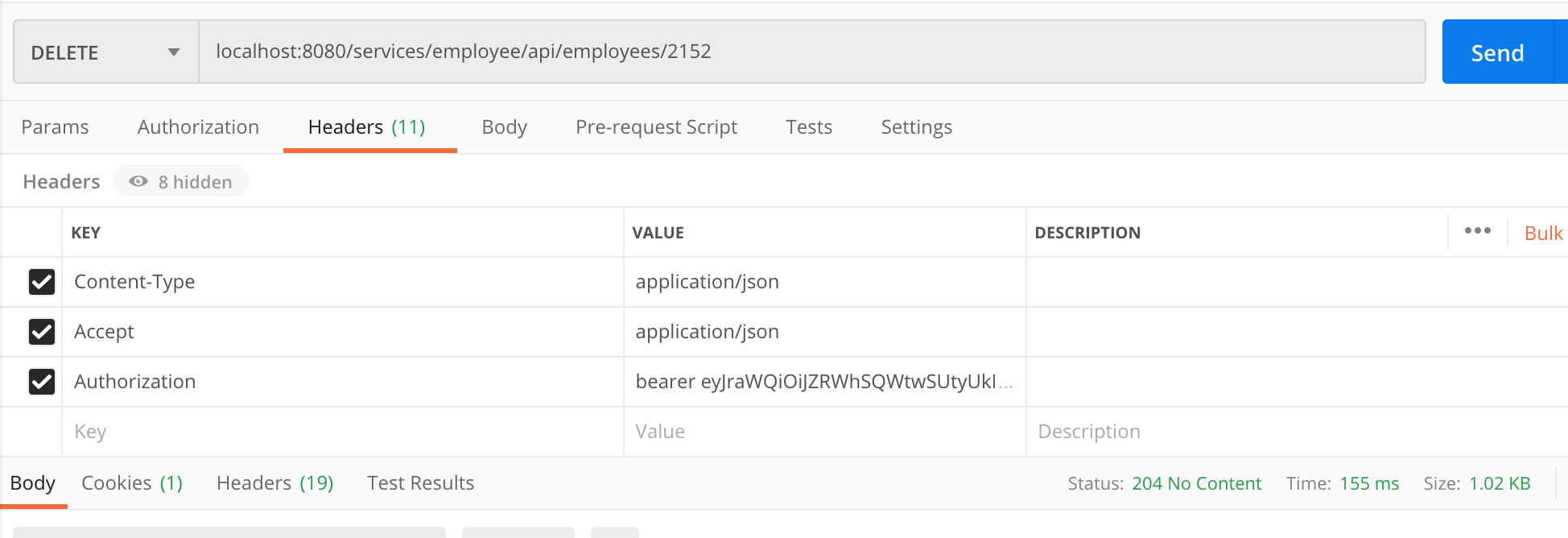 You can now attempt to delete your employee, make sure you use your employee ID instead of the one in this example as it's a generated value: