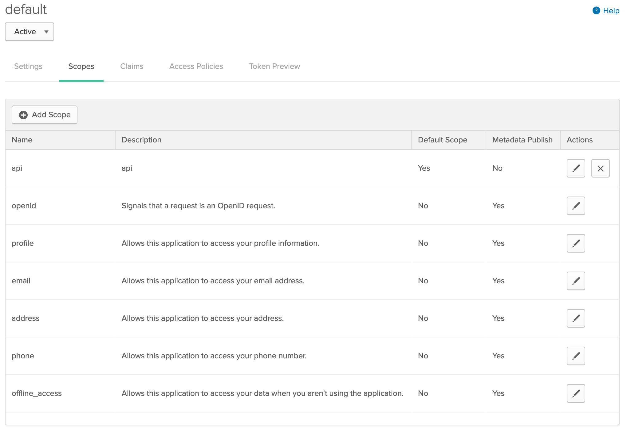 Now add a custom scope, I named mine api and make it a default scope: