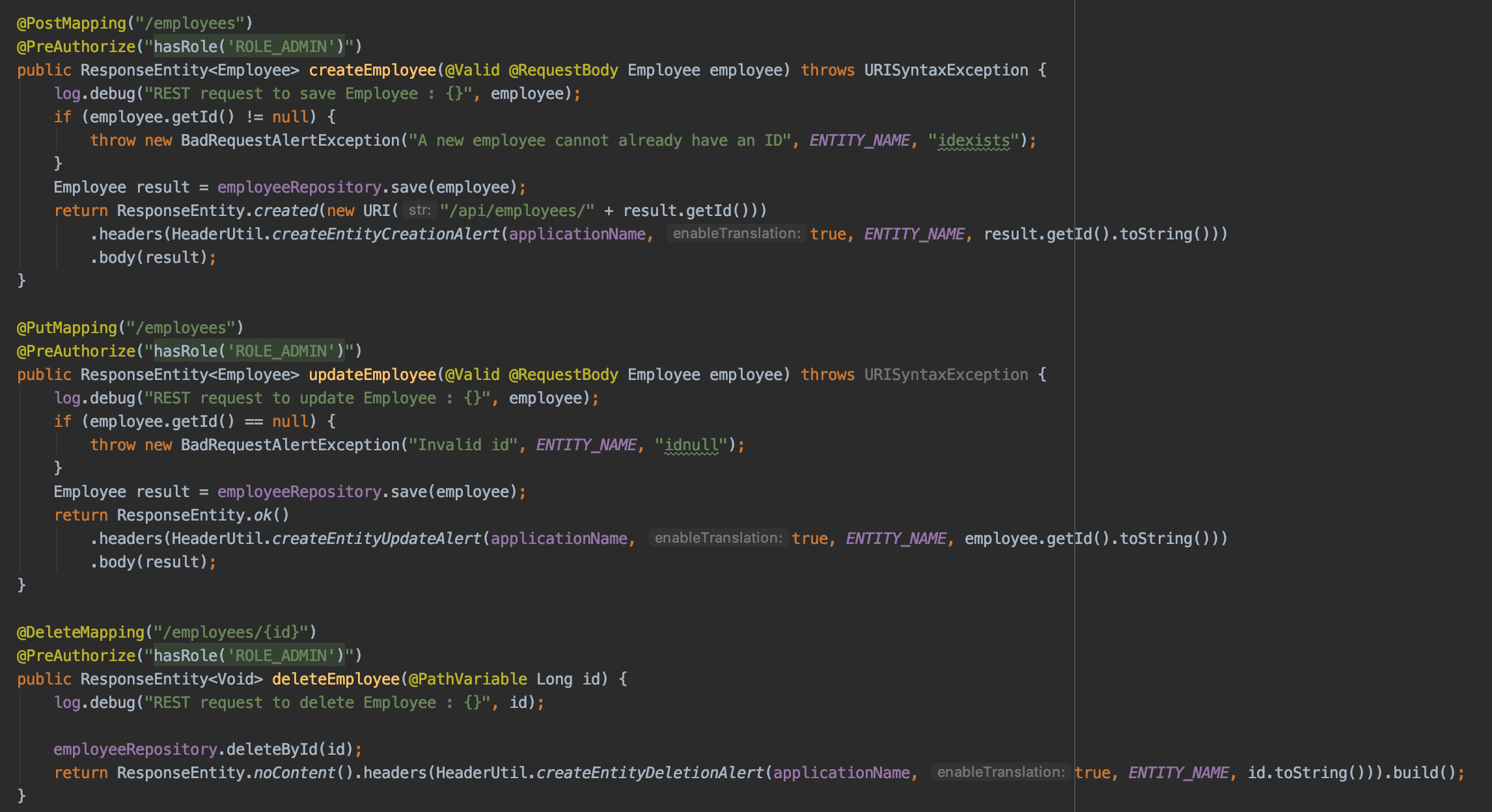 In the Employee microservice let's secure the Create, Edit and Delete endpoints. This can be done by adding @PreAuthorize("hasRole('ROLE_ADMIN')") to the three methods like this: